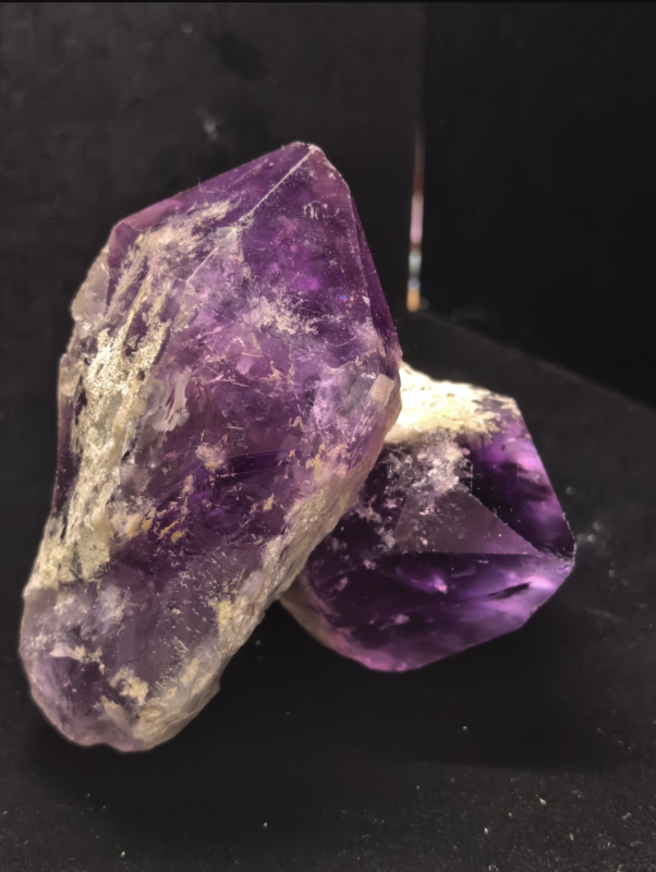 Amethyst belongs to the quartz family and grows in the same hexagonal crystal system as clear quartz and citrine — forming in long six-sided prisms with distinctive pyramid-like terminations. Unlike clear quartz, amethyst crystals often form in geodes and cavities, where they grow freely into beautiful pointed clusters. A well-formed amethyst cathedral geode, with its interior lined with purple crystal points, is one of the most dramatic mineral specimens in the world.
