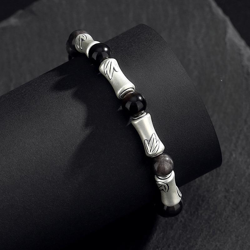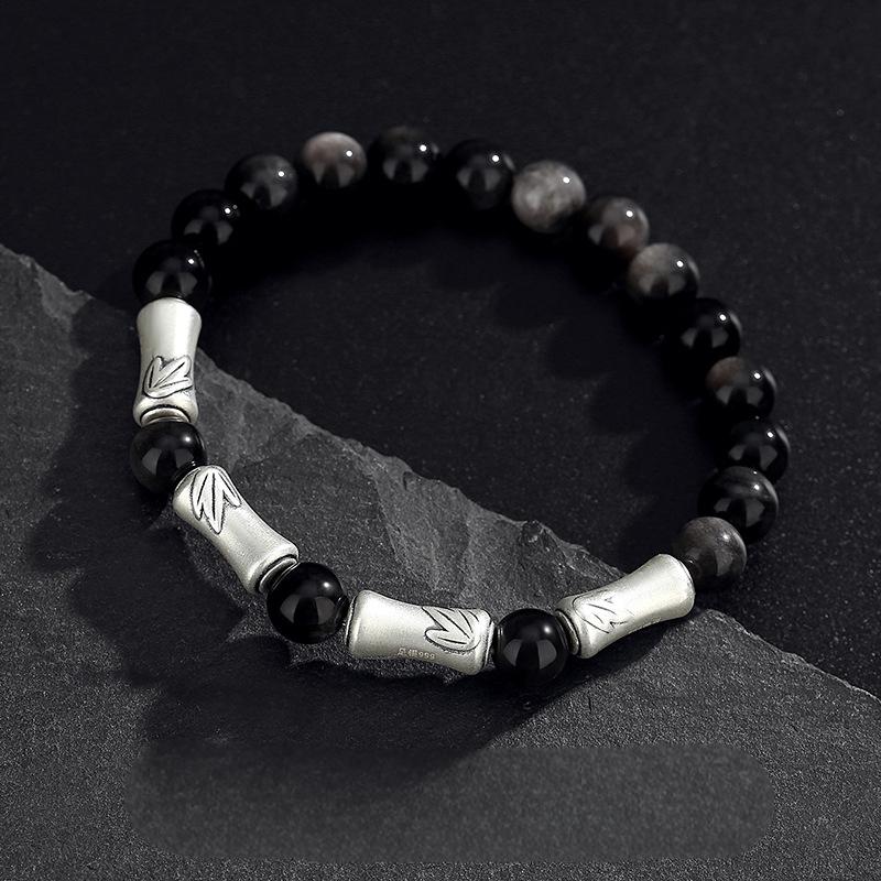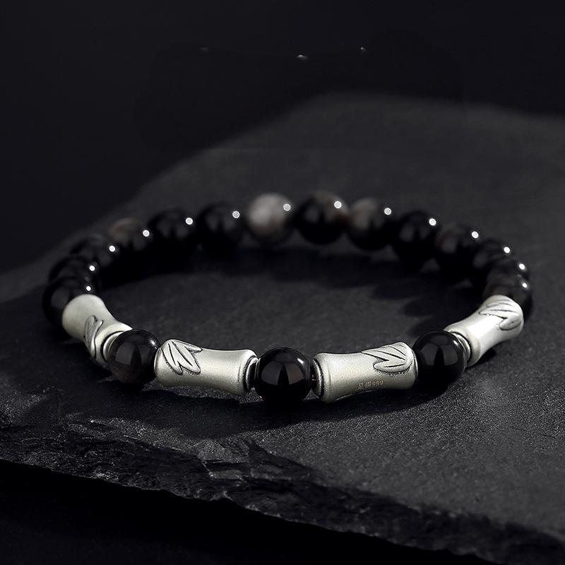 This is a handcrafted bracelet featuring 8mm natural obsidian beads and four polished S925 sterling silver bamboo joint accents. The 6.9mm diameter silver joints, each measuring 14.5mm in length, symbolize growth and resilience while complementing obsidian’s protective energy. Designed for modern individuals seeking emotional balance and spiritual protection, this piece merges Eastern symbolism with contemporary minimalist style for everyday wear.