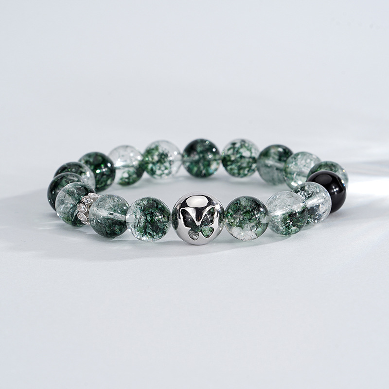 This green phantom crystal bracelet brings double value of emotional comfort and decorative beauty to daily life. The soft and deep green hue of the phantom crystal helps to soothe restless emotions, calm the chaotic mind, and cultivate a peaceful and stable inner state, making it easier to stay focused and positive in daily work and life. It helps to enhance inner clarity, reduce unnecessary anxiety and impetuousness, and nurture a gentle and optimistic attitude towards life. The matching silver sheen obsidian strengthens the sense of emotional stability, while the delicate silver butterfly adds a touch of gentle elegance to personal style. Wearing it daily can not only elevate your overall look with a unique and refined accessory, but also accompany you to maintain a balanced and tranquil emotional state, becoming a gentle spiritual companion for everyday moments.