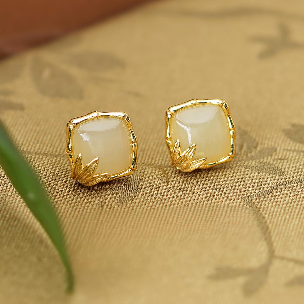 These 10mm square Hetian jade stud earrings are set in polished S925 silver, with delicate bamboo leaf accents that add a quiet, poetic touch. The warm, translucent texture of the natural jade contrasts beautifully with the smooth silver finish, creating a minimalist yet sophisticated piece that bridges Eastern elegance and modern style.